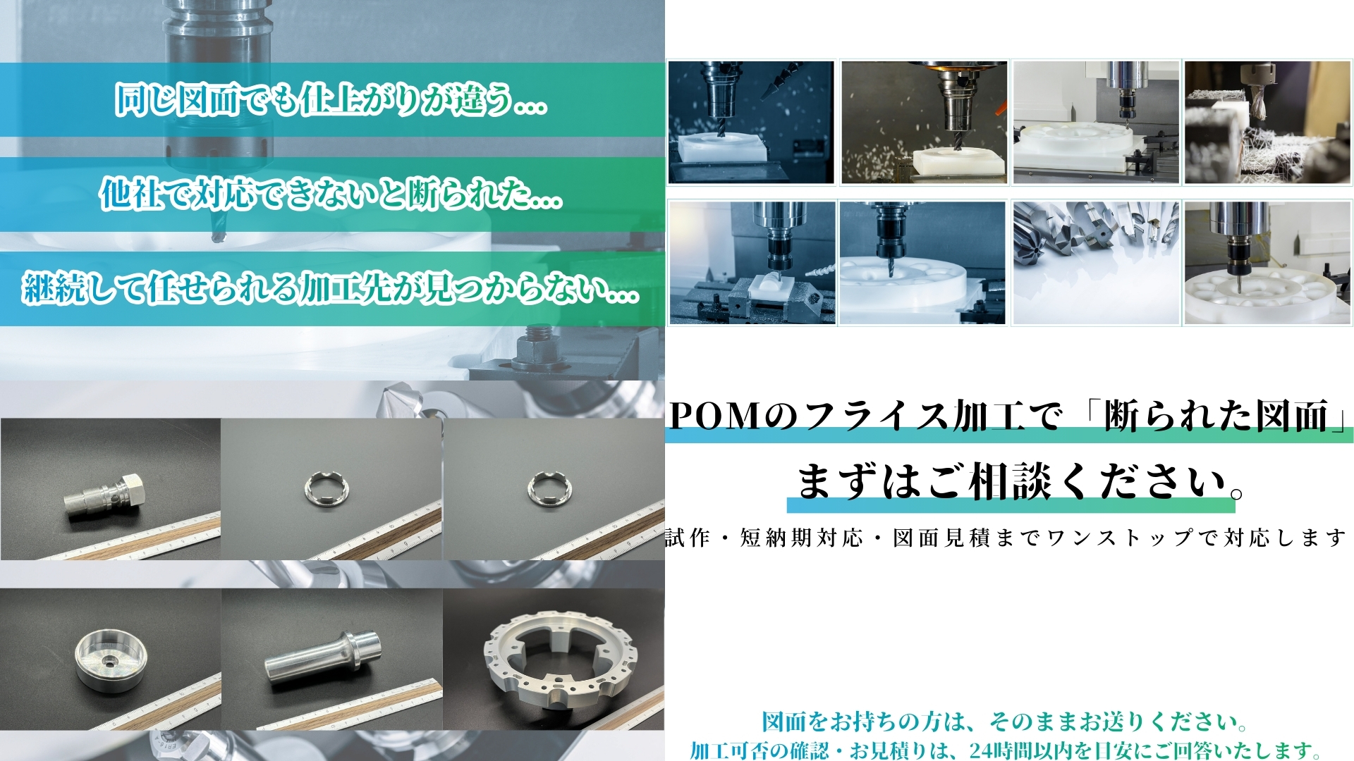 「精度が出ない」「納期が間に合わない」「小ロット対応してくれる業者が見つからない」といった課題に対し、POMのフライス加工に特化した加工体制で、品質・スピード・コストの最適解を提供します。